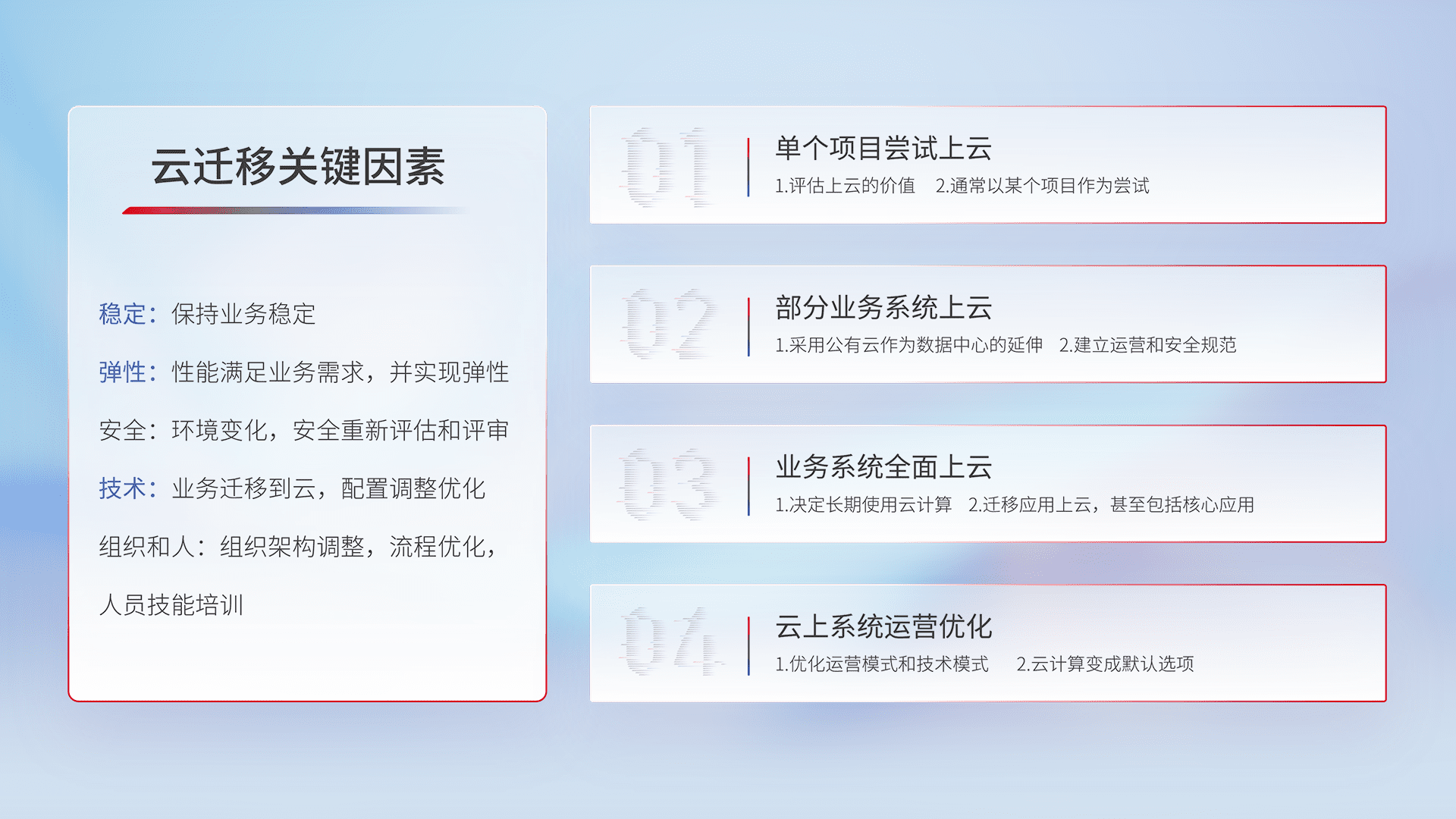 结合实际业务,,从规划设计、、云平台选型、、、、云原生改造、、数据迁移、、、、集成交付,,,,迁移全过程为客户识别最佳上云路径,,,,做好风险识别管理,,设计网络架构、、身份权限、、、、安全审计合规、、操作审计、、、日志审计、、、、监控告警策略、、、多站点容灾设计等,,,对云上基础设施进行整体规划,,提升IT治理水平,,,以满足弹性、、、、高可用、、、、高性能的需求。。。。